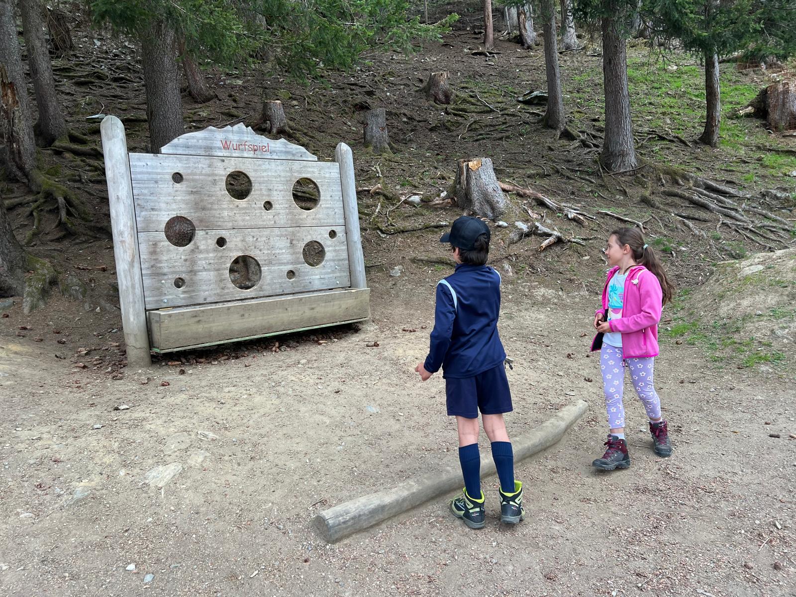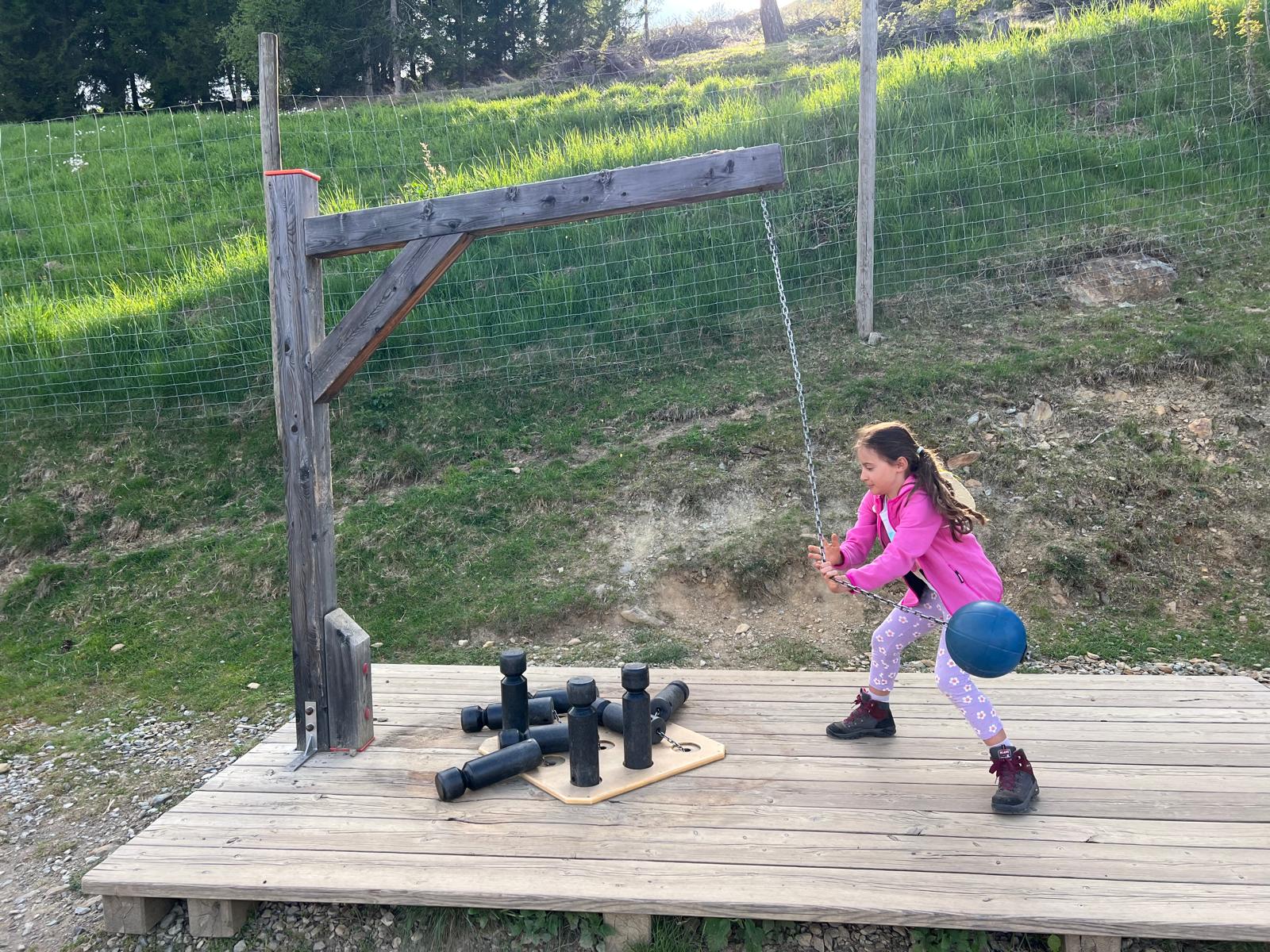Durante il percorso si incontrano diversi punti gioco adatti ai bambini: la scacchiera con il gioco del “filetto”, il tiro a segno con le pigne, il gioco delle biglie di legno (un classico di molti parchi), il gioco dei birilli, il percorso sui tronchi, il percorso dell’acqua, la sabbiera, l’arrampicata.